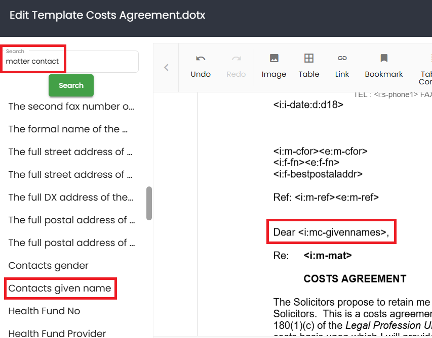 - Enter here the code you are looking for - for example if you are wanting to add the first name of the matter contact, search matter contact,
