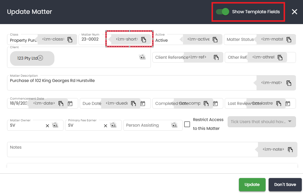 - In the top left corner you will see a toggle that says 'Show Template Fields' - toggle it on