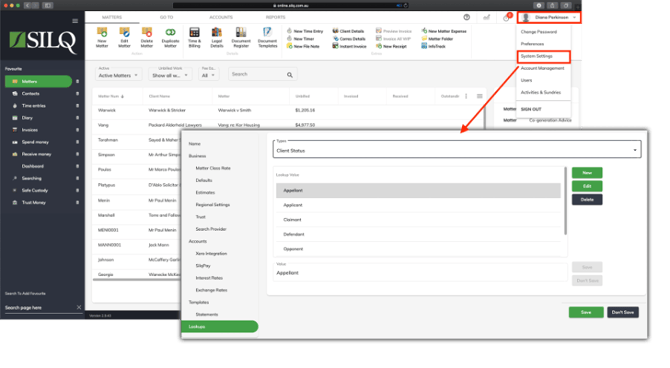 For example, if there is a particular matter description you always deal with, instead of having to type the Matter description in every time you create a new matter, you can predefine the text that will appear in that drop down list, and just click it. Lookups can be edited and added by clicking on your name in the top right corner to view the drop down menu, then clicking System Settings.