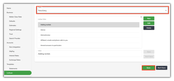 To add your own Lookup for example to the Matter Type drop down list in the Update matter window, click the New button and then enter your text in the value field below the Lookup box and then click Save.