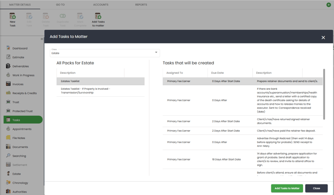 However, if there are multiple task packs for the matter class you will need to add those into the matter.