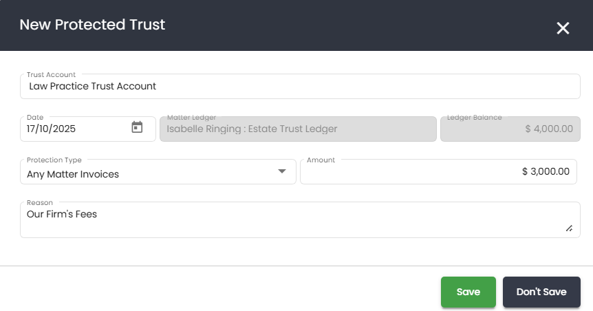 Use the Protected Trust option to effectively block trust funds from being able to be used unless for a specific reason - e.g. protect $6,000 from Trust to pay Barrister fees.