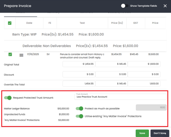- Protect as much as possible – when toggled on this will allocate as much Trust funds as possible to protect on the invoice created. Using the example above, $10,000 in trust with $1,000 unprotected, however the invoice total is $1,600. In this instance SILQ will protect $1,000 against this invoice so that the amount protected is not able to be withdrawn. Please note however, this means that the remaining $600 is not protected as there are no further unprotected funds in trust. However, had you had $2,000 available, the whole $1,600 would be protected.