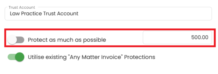 If you toggle off the option to protect as much as possible you can type in an amount of your choosing to protect against the invoice. This allows you to choose how much in the Trust ledger you would like to apply to the invoice. For example, if you only wanted to apply $500 from Trust for whatever reason, then you would type in $500. - Utilise existing “Any Matter Invoice” Protections - This option is on by default but will only be used if you have previously entered a protected trust amount in SILQ and selected the option "Any matter invoice".