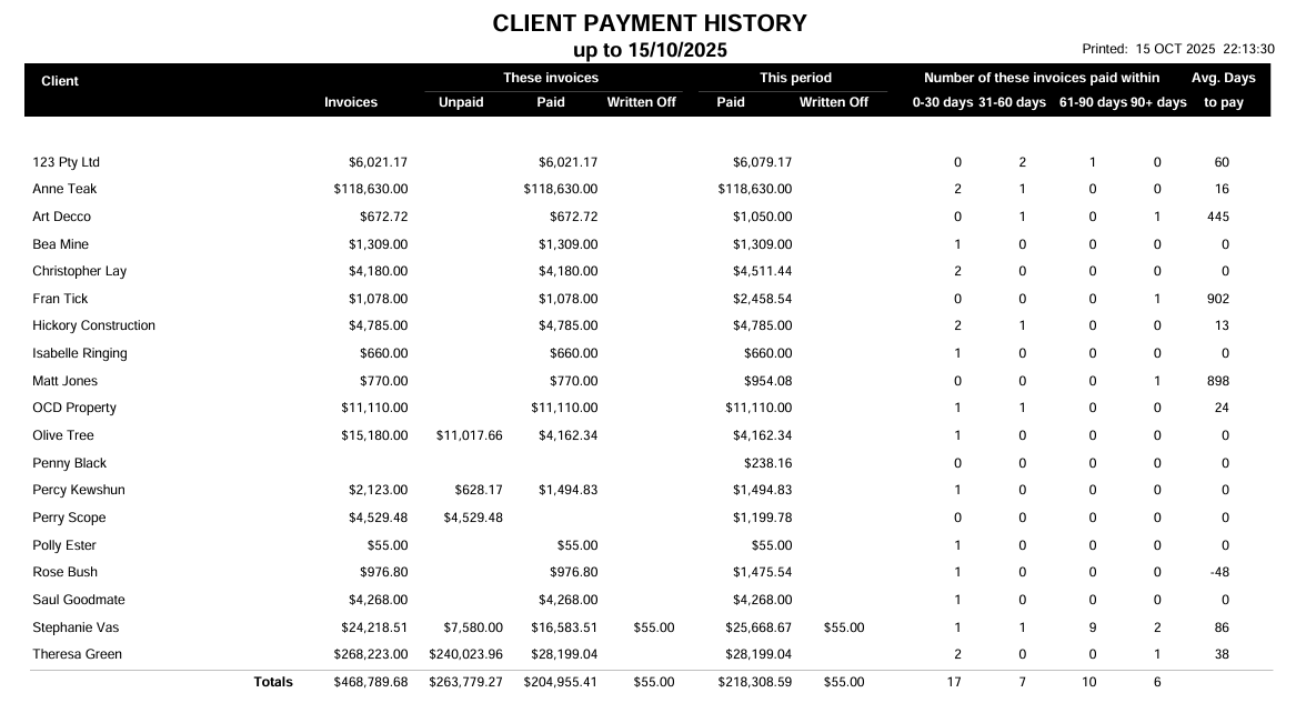 This report breaks down client payment activity, giving clear insight into how long clients take to pay invoices after issuance.