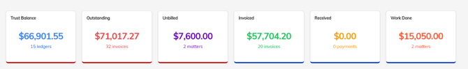 View summary numbers like how much is outstanding or work yet to be invoiced plus stats on billable hours broken down by Fee Earner over a particular period.