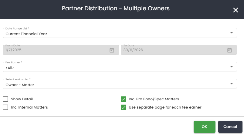 The Partner Distribution Report is designed to give law firms full visibility over the performance of matter owners (typically partners or principals) by comparing revenue generated against expenses incurred. This helps support transparent bonus calculations, KPI tracking, and strategic financial planning at the partner level.
