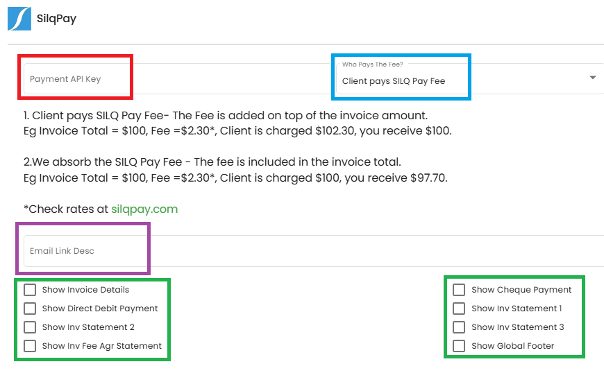 - Choose who pays the fee - You can decide to absorb the fee or you can pass the fee onto the client (see the blue box in above image)
