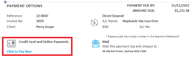 - When a client clicks the payment link, they’ll be taken to a secure payment page branded with your practice’s details.