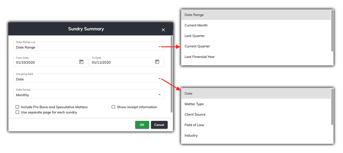 Date - this will group by the date the sundries are recorded and will not take into consideration what matter, client etc it is for when grouping.