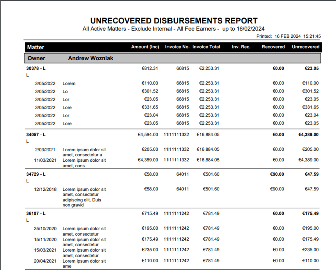 The Unrecovered Disbursements Report identifies disbursements that have already been invoiced to the client and fully paid, but where the corresponding third-party expense has not yet been paid by the firm.