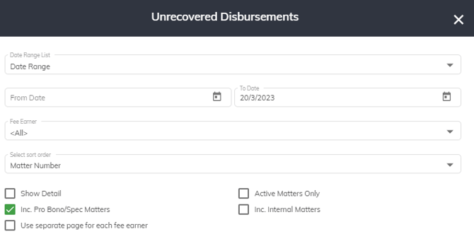 From the reports window, when you click on unrecovered disbursements you are presented with the below window. You choose your date range and also the sort order - either Matter Number, Matter Name, Client Name, Amount, Owner - Matter, Owner - Client, Primary FE - Matter or Primary FE - Client.