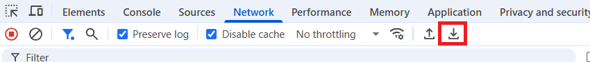- Once you have reproduced the issue and the Network tab has loaded all the content, click the Export HAR (sanitized)... icon in the action bar at the top of the Network panel.
