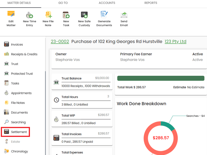 - From the left hand matter navigation, click on the settlement icon