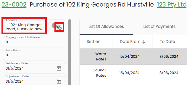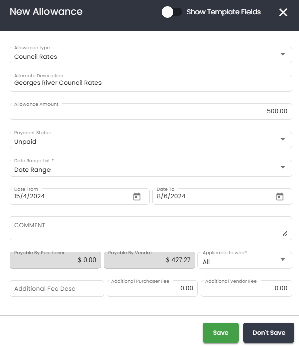 - Additional Fee Description - allows you to include extra fees within an existing allowance — for example, where council rates have been paid but outstanding interest or charges remain. This keeps all related adjustments grouped together rather than creating a separate allowance.