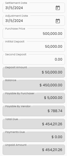 - Total Due - This is the amount due from the purchaser to the vendor. The calculation is Balance Due plus Payable by Purchaser minus Payable by Vendor.